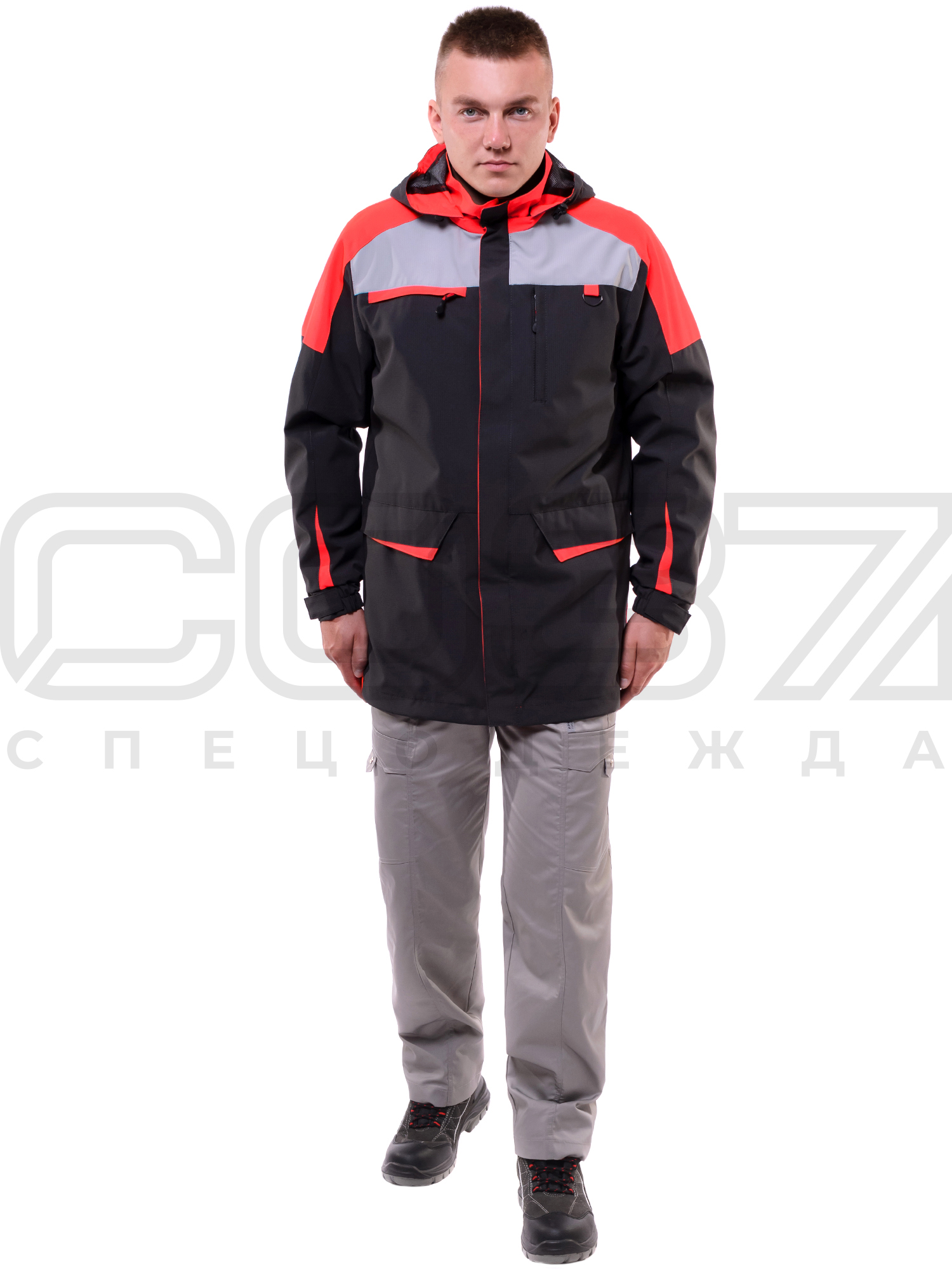 - Пристёгивающийся на молнию капюшон с регулировкой объёма по лицевому срезу при помощи шнура с фиксаторами и в затылочной части с помощью паты, застёгивающейся на ленту-контакт.